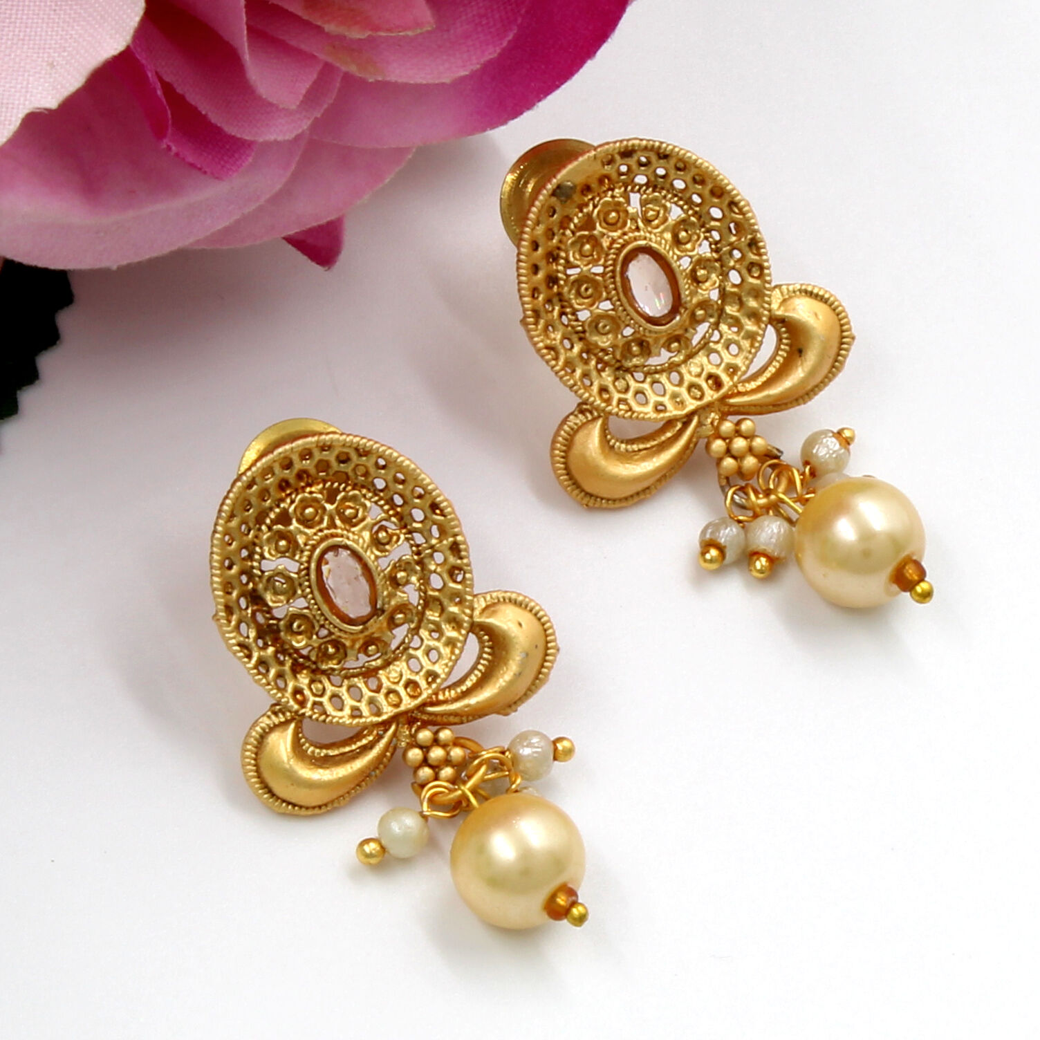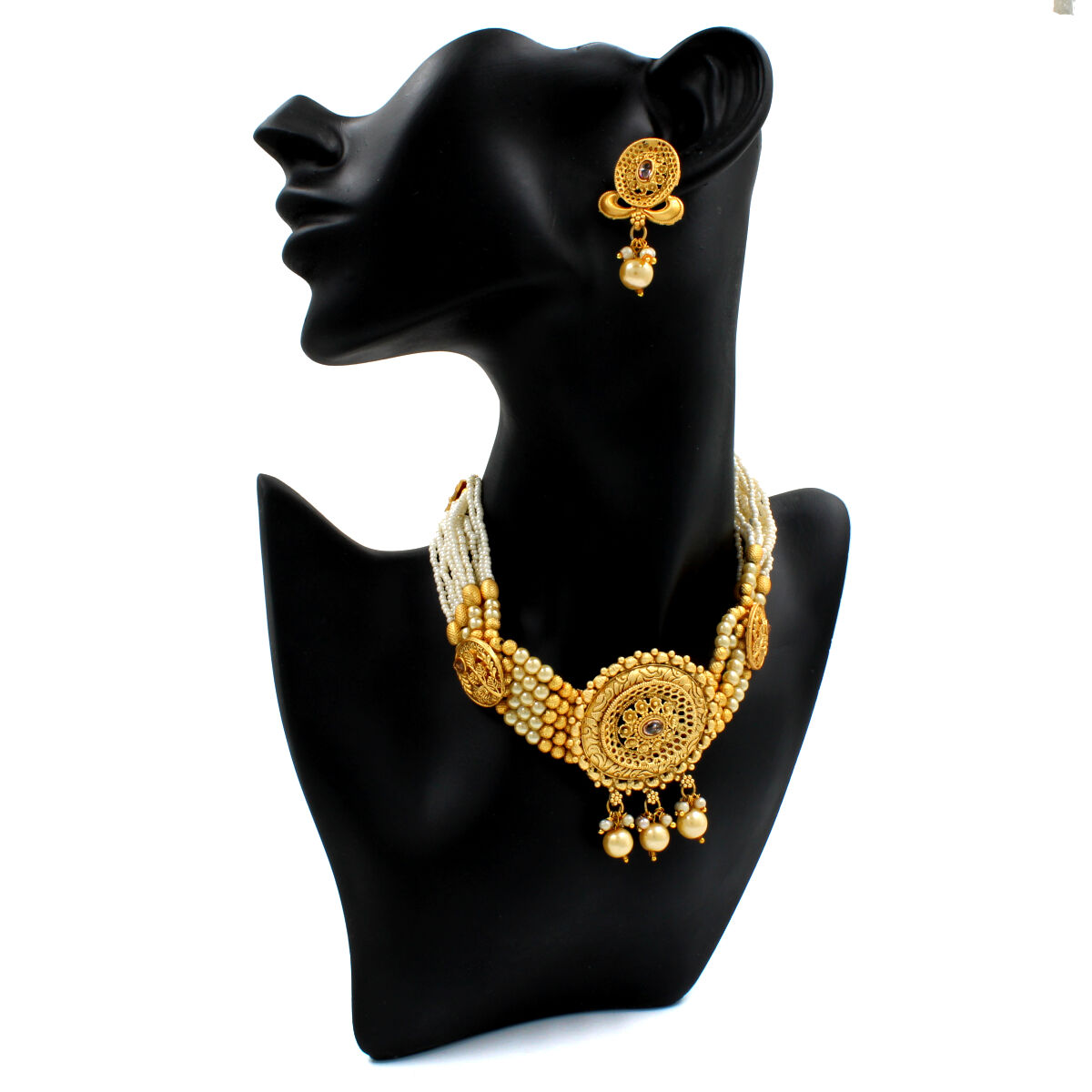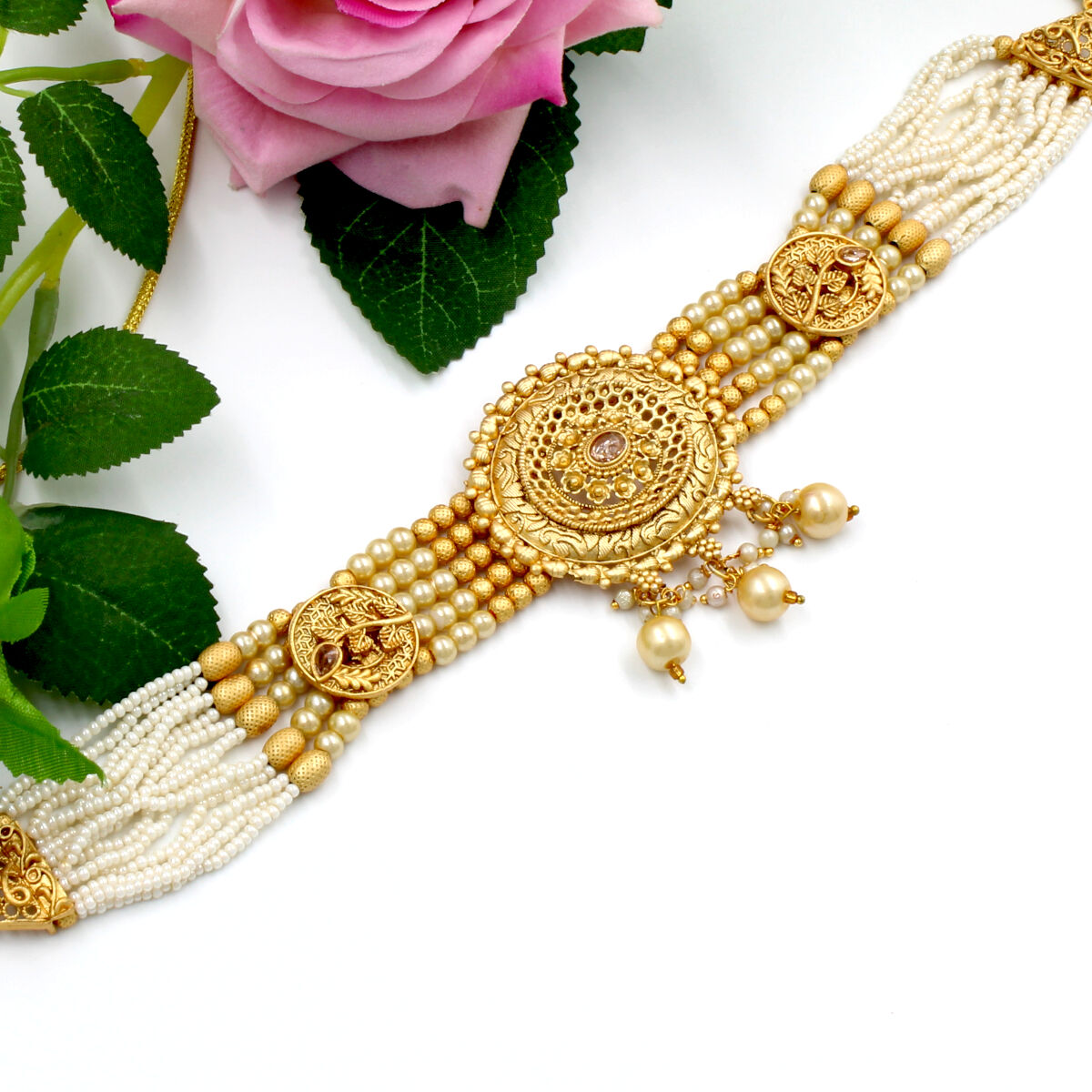 Orlenna's exclusively designed Rajwadi Pearl & Crystal Beads Choker. A complementary earring set accompanies the necklace set. The choker comes with an adjustable metal back dori. This piece of jewellery is made of a mixed metal alloy. Dare to dazzle with this piece of Orlenna Jewellery.