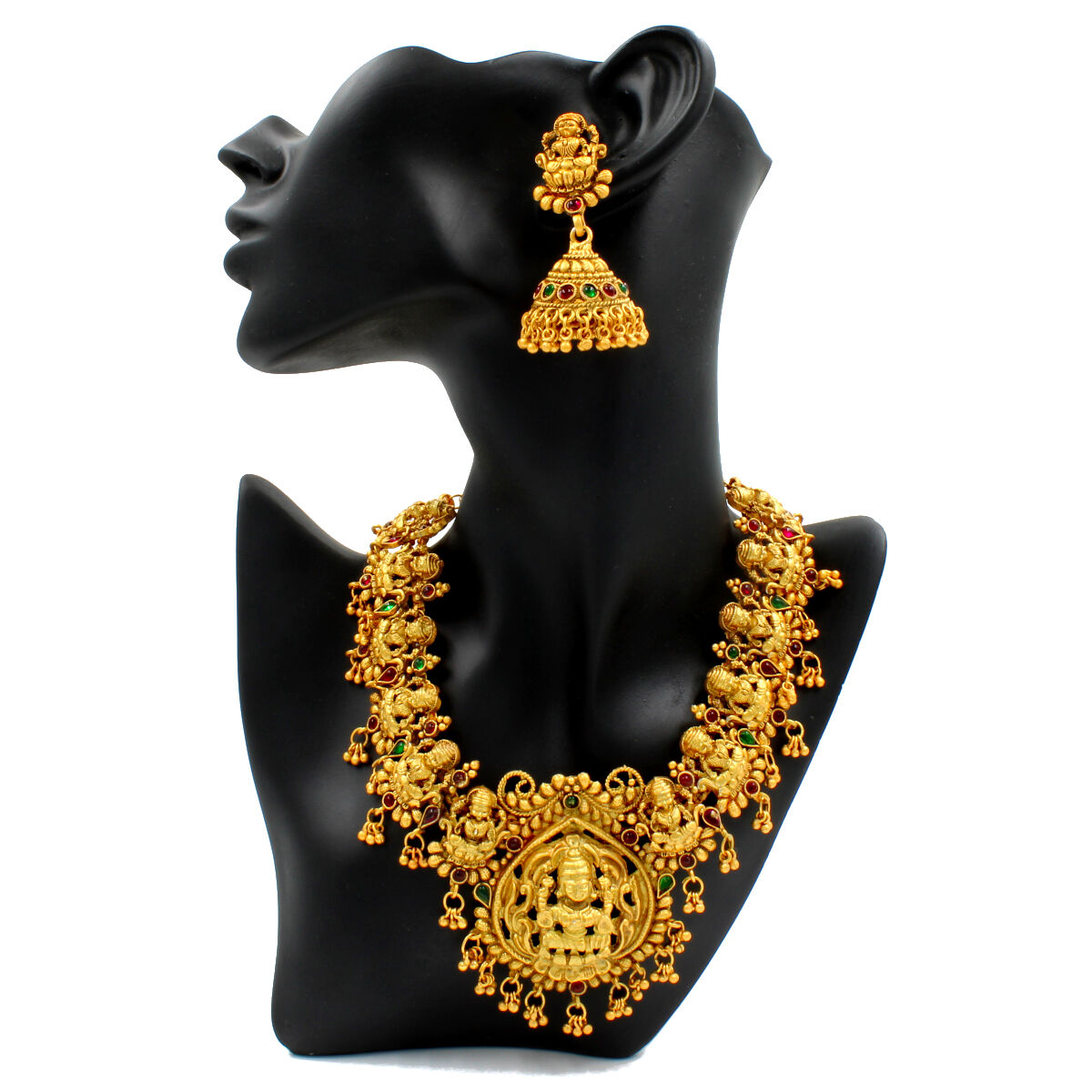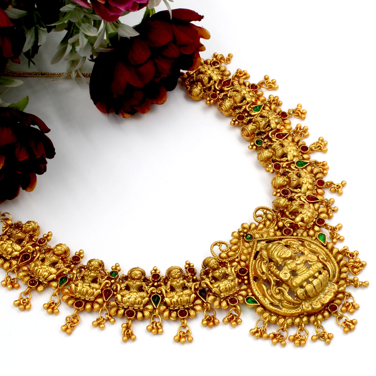 Orlenna offers an intricately designed Temple Crystal Beads Choker. The set comes with complementary earrings to enhance your beauty. The choker comes with an adjustable metal back dori. Mixed metal alloy is used as the base material for this choker..Orlenna is a timeless treasure.