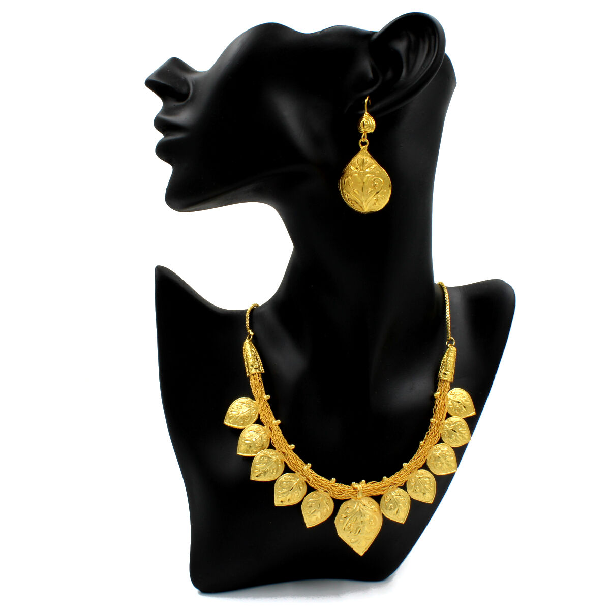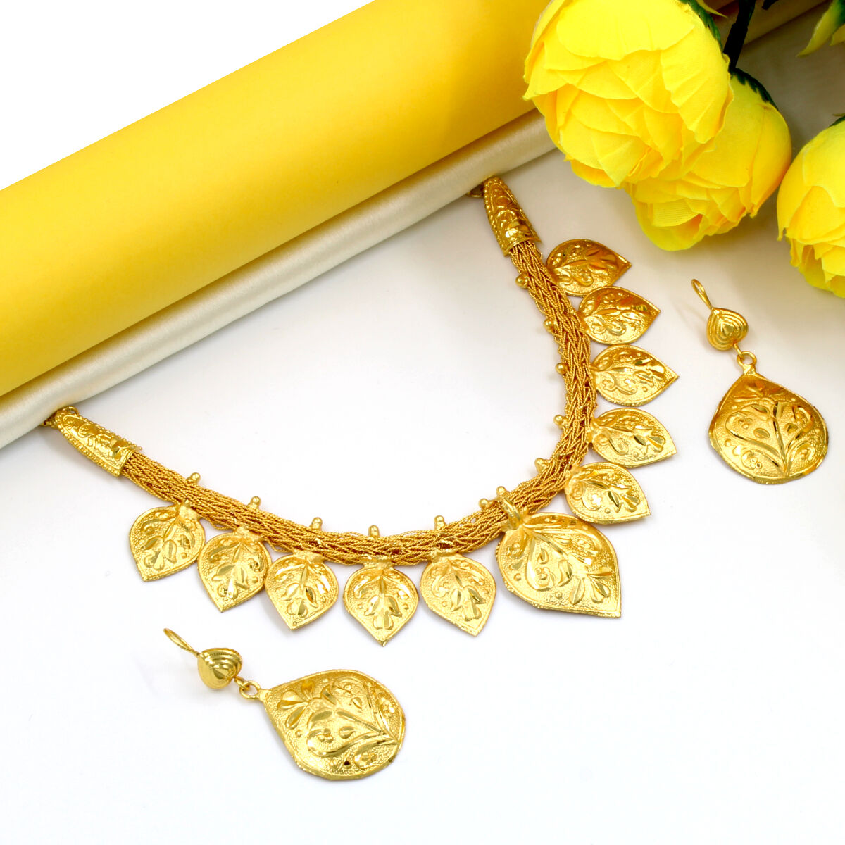 Orlenna's exclusively designed Gold Plated Short Necklace Set. Beautiful pair of earrings comes with the necklace set. The necklace comes with metal chain as necklace back rope/ dori. The base material used in this Orlenna masterpiece is mixed metal alloy. This Orlenna masterpiece will put you in the spotlight. SHINE LIKE ORLENNA