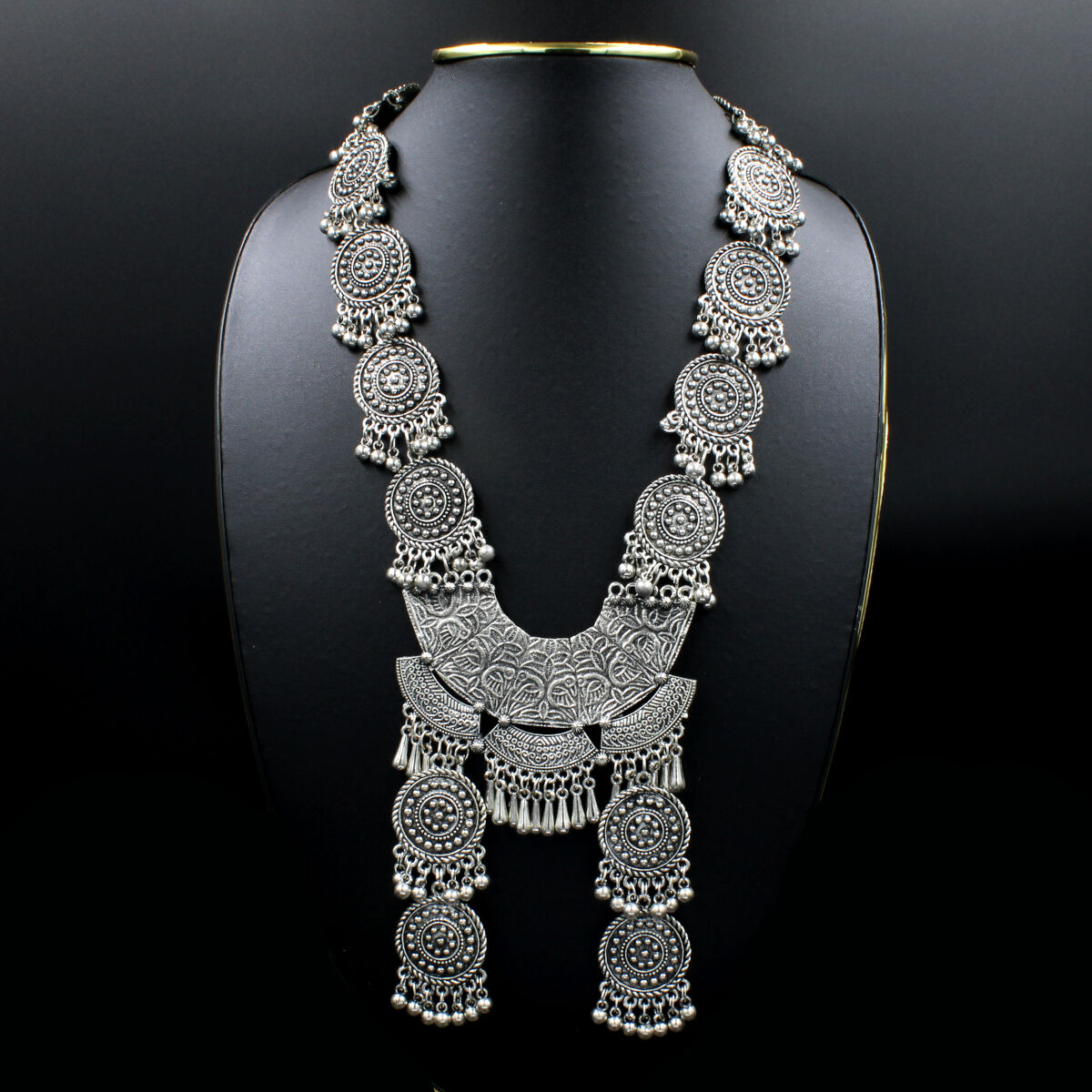 Orlenna's fine Oxidized Long Necklace Set . . This Orlenna masterpiece is made in mixed metal alloy [ base material]. The set comes with complementing earrings. Orlenna is a timeless treasure...