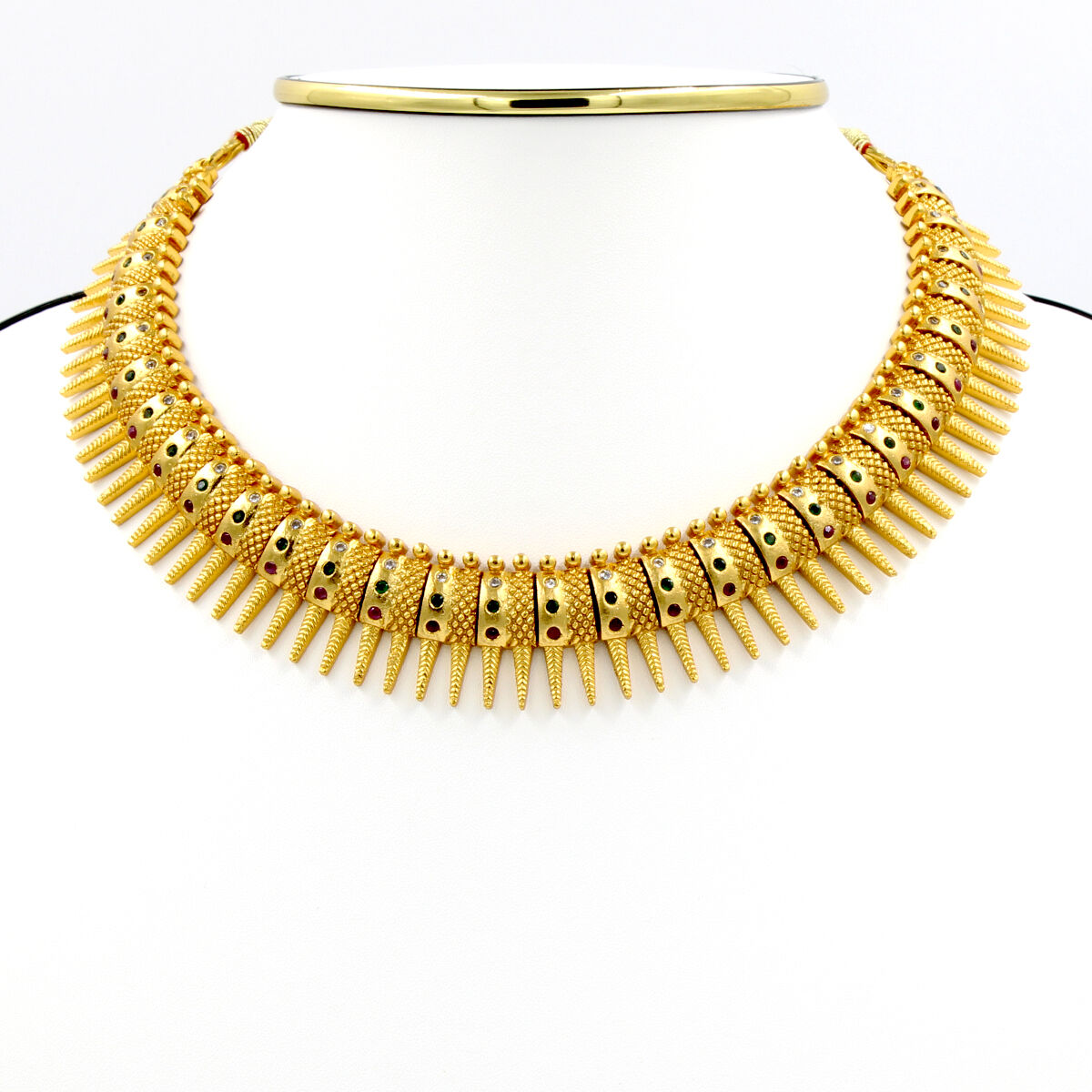 Groom yourself with Orlenna Temple Jewellery - Choker Studded with American Diamond. The choker comes with complementing silk thread rope / metal chain as necklace back rope/ dori. The base material used in this Orlenna masterpiece is Copper alloy.. The set comes with complementing earrings. You’re Not Fully Dressed Until a Piece of Orlenna Jewellery adds Some Sparkle to It..