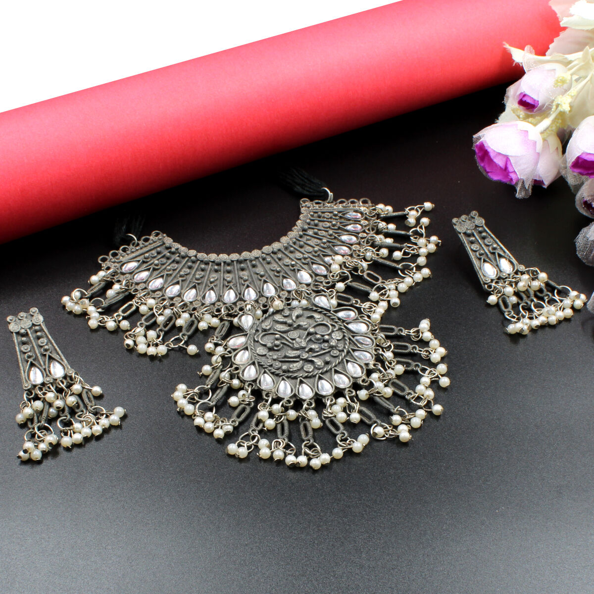 Ethnically designed Orlenna Black Metal Necklace Set. The necklace comes with adjustable black cotton back rope/ necklace dori.. This Orlenna masterpiece is made in mixed metal alloy [ base material]. The set comes with complementing earrings to enhance your beauty. Dare to dazzle with Orlenna masterpieces..