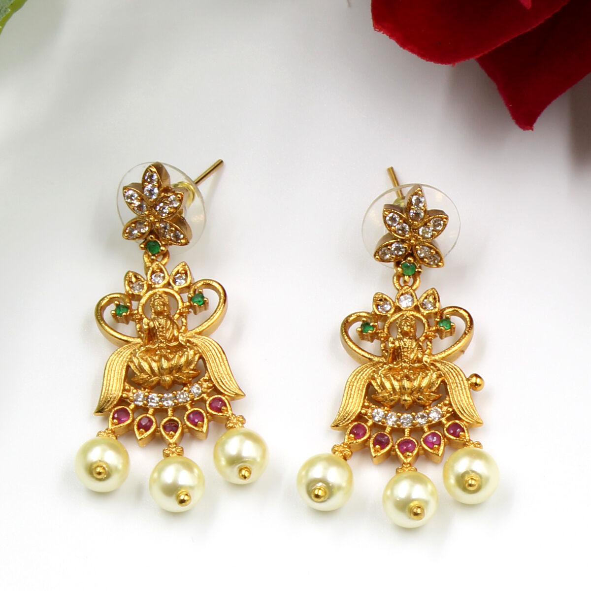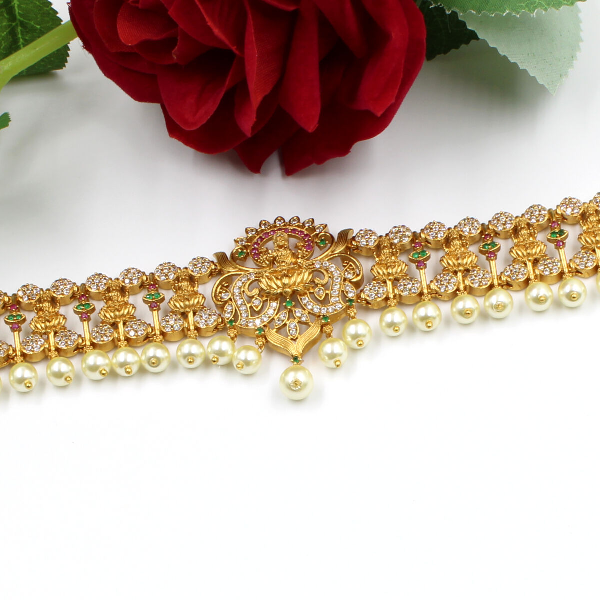 Orlenna offers intricately designed Temple Jewellery - Choker Studded with american diamond and embellished with pearls. The choker comes with complementing silk thread rope / metal chain as necklace back rope/ dori. The base material used in this Orlenna masterpiece is Copper alloy.. The set comes with complementing earrings to enhance your beauty.