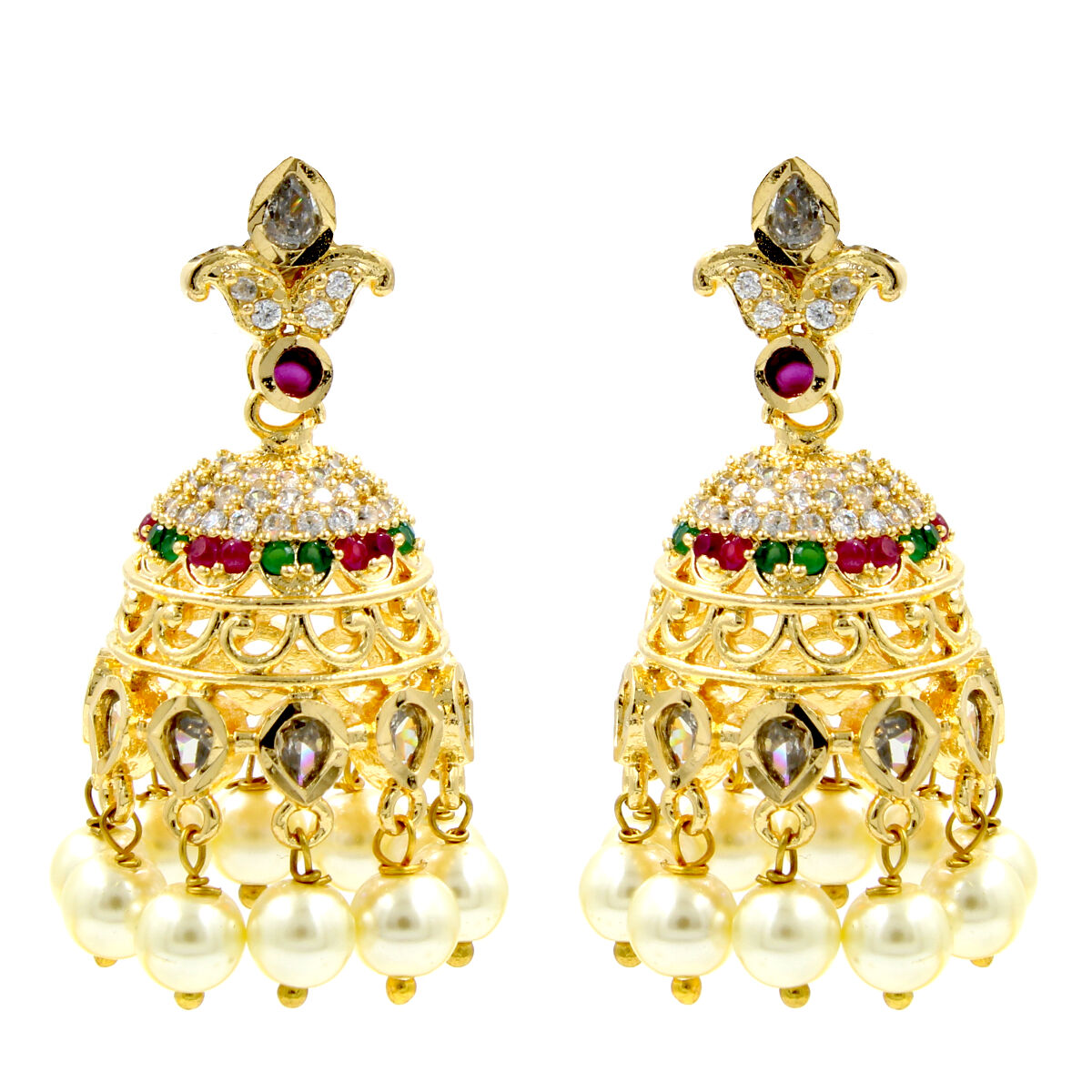 Groom yourself with Orlenna Temple Jewellery - Jhumka Earring set Studded with American diamond and embellished with pearls. . This Orlenna masterpiece is made in Copper alloy [ base material]. . This Orlenna masterpiece will put you in the spotlight..