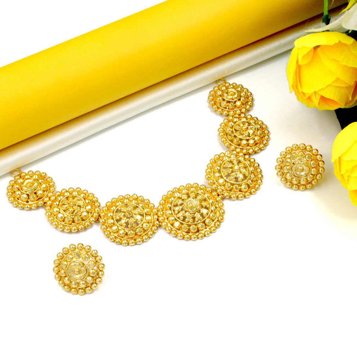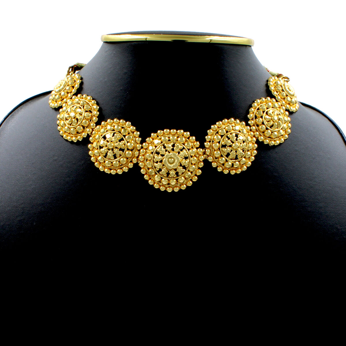 Orlenna presents Gold Plated Short Necklace Set . The necklace comes with adjustable silk thread back rope/ dori. The base material used in this Orlenna masterpiece is Copper alloy.. The set comes with complementing earrings to enhance your beauty. Orlenna Jewellery is a way of keeping memories alive...